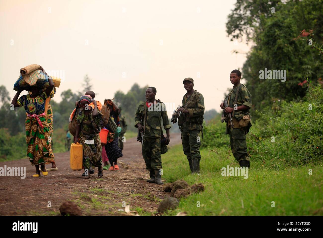 Displaced Families Walk Past M23 Rebels At Rumangabo After Government Troops Abandoned The Town 23 Km 14 Miles North Of The Eastern Congolese City Of Goma July 28 2012 Democratic Republic Of