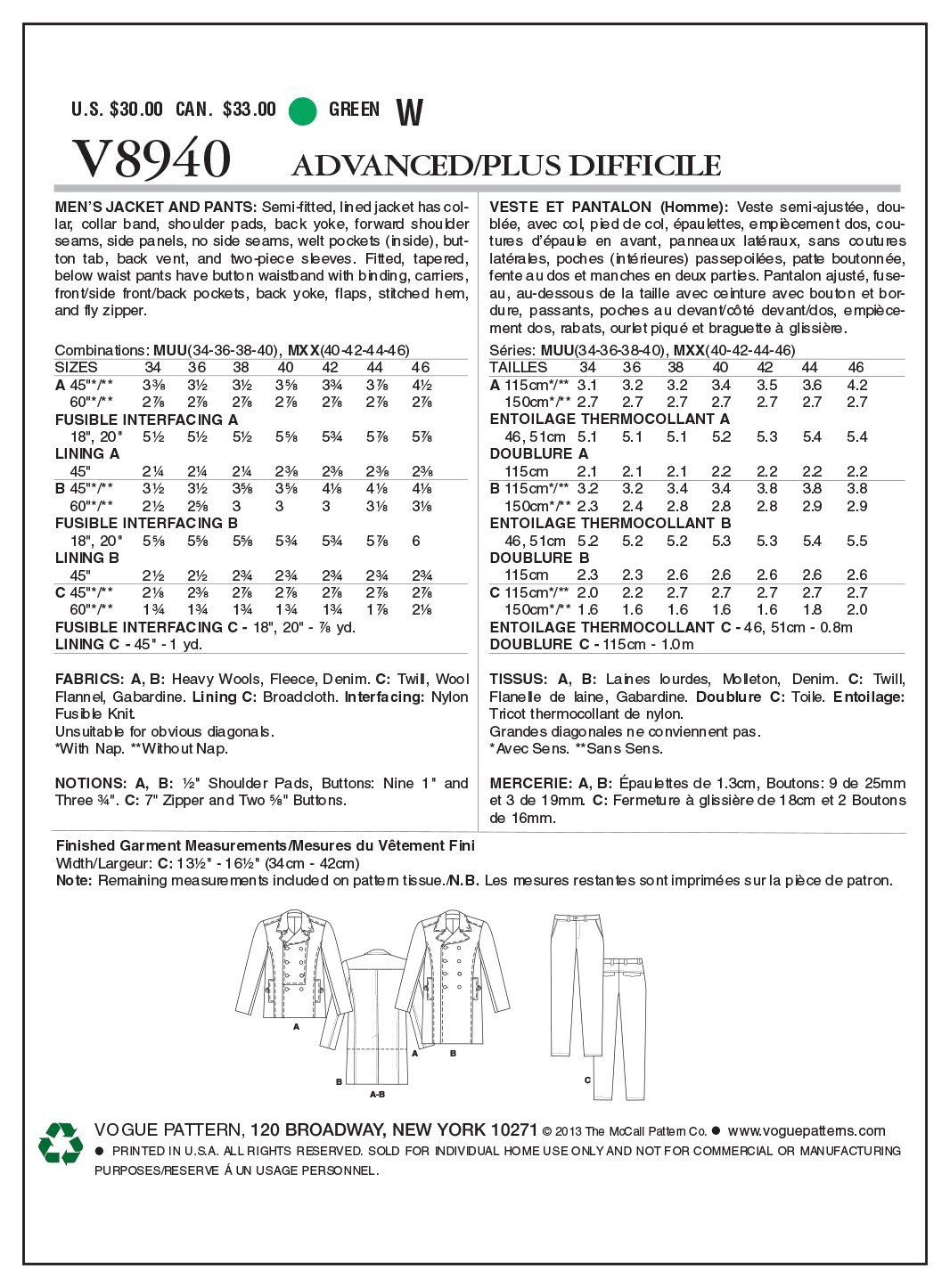 Vogue Patterns V8940 Men S Jacket And Pants Sewing Templates Size Muu 34 36 38 40